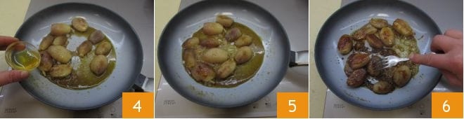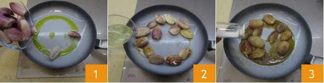 Una vez evaporado el caldo vegetal, añadid la miel 4 y dejad cocinar durante otros 2-3 minutos 5, continuando dando la vuelta a las chalotas 6 para permitir una cocción uniforme y que la miel se integre completamente con las chalotas. Las chalotas estarán entonces listas.