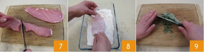 Ahora proceded con la preparación de los escalopines. Colocad los escalopines en una tabla de cortar y obtened pequeñas lonchas 7. Luego verted la harina en un recipiente grande y enharinad las lonchas de carne pasándolas por todos los lados 8. Es importante que las lonchas estén completamente cubiertas de harina. Reservad las lonchas enharinadas en un plato. Luego tomad la salvia y el romero. Quitad las agujas de la parte leñosa del romero. Picad finamente la salvia y el romero juntos 9. Reservad en un cuenco la mezcla de especias.
