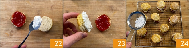 Unten la parte superior con la crema de nata y mascarpone 22, luego cierren 23. Procedan de esta manera para rellenar todos los scones, luego espolvoreen con azúcar glas 24 y sirvan!
