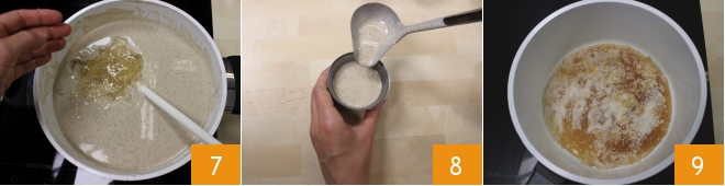 Una vez alcanzada la temperatura, escurra y exprima muy bien las hojas de gelatina, luego agréguelas a la mezcla y mezcle hasta que se disuelvan completamente (tardará unos minutos). Apague el fuego y vierta la mezcla en los moldes de semifrío 8. Deje enfriar bien la mezcla en los moldes y luego transfiéralos al frigorífico durante al menos 3-4 horas. Media hora antes de servir los semifríos, prepare el caramelo al café: coloque en un cazo de fondo grueso el azúcar y, a fuego bajo, hágalo disolver completamente 9,