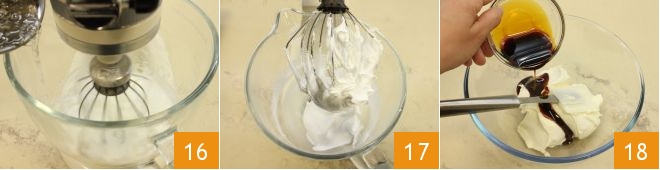 Cuando el jarabe haya alcanzado la temperatura indicada, viértelo en hilo sobre las claras 16, continuando montando con las varillas hasta el completo enfriamiento del merengue 17. Mientras tanto, en un bol coloca el mascarpone, incorpora la salsa de caramelo 18 y una pizca de sal, mezclando con una espátula