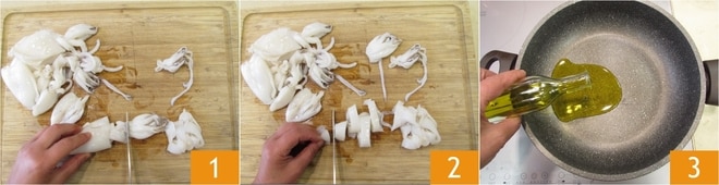 Para preparar las sepias con guisantes y panceta Cómo limpiar las sepias, separa los tentáculos 1 y córtalas en trozos 2. Vierte el aceite en la sartén 3.