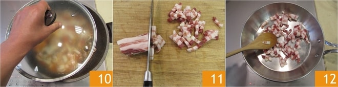 Cubre con la tapa 10 y baja el fuego, cocina así durante unos 30 minutos. Corta la panceta en tiras 11 y dórala en una sartén ligeramente calentada 12.