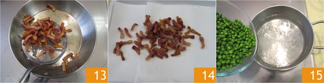 Cuando esté dorada y crujiente, escúrrela de la grasa liberada durante la cocción con una espumadera 13, colócala sobre un paño de cocina 14, mientras reservas la grasa. Cocina los guisantes durante 5 minutos en abundante agua ligeramente salada 15.