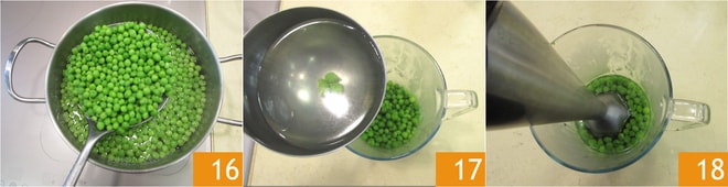 Escúrrelos 16 y viértelos en un vaso alto con un poco de su agua 17. Bátelos con la batidora de inmersión 18.