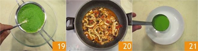 Cuela el puré a través de un colador para hacer la crema más lisa 19. Una vez listas las sepias 20 puedes emplatar con la crema de guisantes como base en el centro 21.