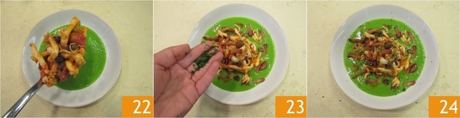 Añade encima las sepias y un poco de panceta, un chorrito de la grasa de cocción de la panceta para dar sabor y para terminar una pizca de perejil 23. Sirve enseguida las sepias con guisantes y panceta 24.