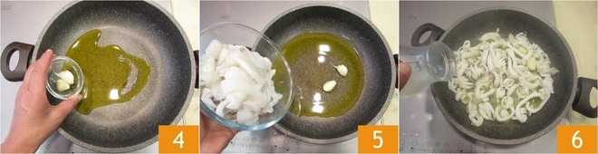 Añade dos dientes de ajo 4, deja que el aceite tome sabor y luego añade las sepias 5. Dora durante 2-3 minutos. Desglasa con el vino blanco 6 y deja evaporar toda la parte alcohólica.