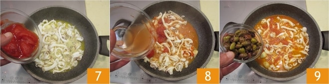Tritura ligeramente los tomates pelados con las manos. Añádelos a la sartén de las sepias 7 con un cucharón de agua caliente 8 y las aceitunas Taggiasca 9. Sala y pimienta.
