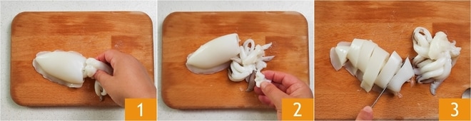 Para preparar las sepias en salsa sin tomate, lo primero que debes hacer es encargarte de limpiar las sepias (como alternativa, pide a tu pescadero de confianza que las limpie): separa la cabeza del cuerpo 1, elimina el pico y los ojos 2, luego abre el manto y retira la piel. Finalmente, enjuágalas bien bajo el agua corriente, incluidos los tentáculos. Corta las sepias en tiras de aproximadamente medio centímetro de ancho 3.