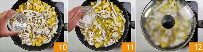 Vierte en la sartén un vaso de agua 10, sala 11 y añade pimienta, luego baja el fuego y cubre con la tapa 12. Cocina a fuego lento durante unos 30 minutos, removiendo de vez en cuando.