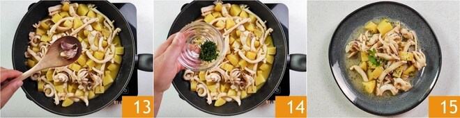 Pasado este tiempo, prueba las patatas para verificar que estén cocidas: deben quedar suaves pero no deshechas. Luego sube el fuego y deja espesar el fondo de cocción durante unos 5 minutos, después retira el ajo de la sartén 13 y perfuma con el perejil picado 14. ¡Tus sepias en salsa sin tomate están listas para ser servidas 15!