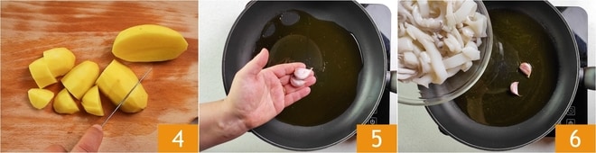 Pela las patatas y divídelas por la mitad a lo largo, luego córtalas nuevamente por la mitad y finalmente en dados no muy grandes 4. En una sartén, sofríe los dientes de ajo con piel 5, luego añade las sepias 6 y sofríe durante un par de minutos a fuego alto.