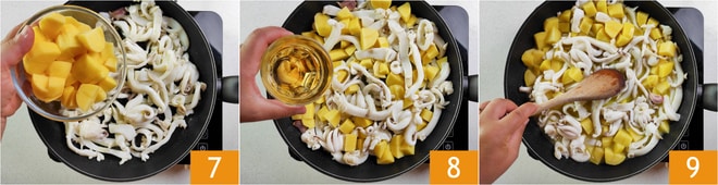 Añade las patatas 7 y desglasa con vino blanco 8, luego deja evaporar la parte alcohólica 9.