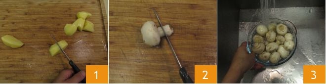 Para preparar setas y patatas, primero pela las patatas, córtalas en trozos 1 y colócalas en un bol grande. Toma las setas, corta el extremo del tallo 2 y luego pásalas rápidamente bajo un chorro de agua fría para eliminar los restos de tierra 3.