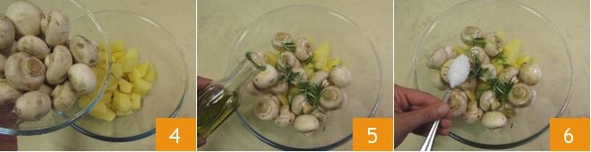 Vierte las setas en el mismo bol 4, condimenta con las agujas de romero, el aceite 5, la sal gruesa 6 y la pimienta negra molida.