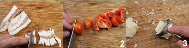 Para preparar los hojaldres clásicos amatriciana, cortad el guanciale en tiras 1 y los tomatitos en cuartos después de lavarlos bien 2. Sacad con un pelador de patatas lascas del pecorino romano 3 y reservadlas.