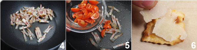 En una sartén antiadherente saltead el guanciale 4 y cuando esté bien dorado, añadid los tomatitos 5 y dejadlos cocinar juntos durante unos minutos para que se impregnen bien de sabor. Una vez listos, montad los hojaldres clásicos amatriciana: colocad en cada hojaldre una o dos lascas de pecorino 6,