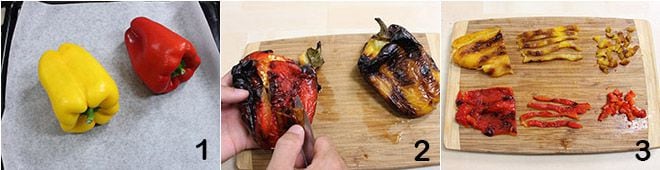 Para preparar los hojaldres de aceitunas con ricotta y pimientos asados, lavad bien los pimientos y ponedlos a asar en el horno con ventilador, a 250°, durante 20 minutos 1. Cuando estén listos, peladlos, quitad las semillas 2 y cortadlos en tiras, luego en daditos, reservando algunas tiras para la decoración final 3.