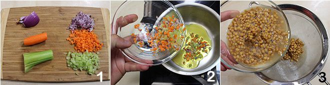 Para preparar los hojaldres con crema de lentejas y cotechino, empiece cocinando el cotechino durante veinte minutos en agua hirviendo. Mientras tanto, prepare el sofrito: lave, limpie y pique finamente la cebolla, la zanahoria y el apio 1, luego sofríalos en una cacerola con 2 cucharadas de aceite de oliva virgen extra, removiendo de vez en cuando 2 (para más detalles sobre la preparación del sofrito puede consultar la ficha de la escuela de cocina Cómo hacer el sofrito). Tome las lentejas, escúrralas bien ayudándose con un colador 3,