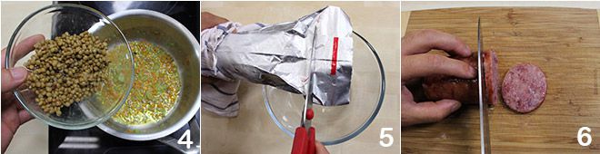 luego añádalas al sofrito 4: deberán dorarse durante unos 10 minutos. Cuando el cotechino esté listo, sáquelo del envoltorio (escurrido completamente el líquido gelatinoso que se forma en su interior) 5 y déjelo enfriar. En este punto, pele el cotechino con la ayuda de un cuchillo, córtelo groseramente y colóquelo en una batidora 6.