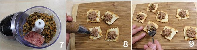 Cuando las lentejas también estén listas, agréguelas en la batidora 7, reservando una cucharada para la guarnición final, y triture todo hasta obtener una mezcla cremosa. Transfiera la mezcla a una manga pastelera con boquilla de estrella y exprima un copete sobre cada hojaldre 8, finalmente decore cada hojaldre con algunas lentejas, ayudándose con una cucharadita 9. Los hojaldres con crema de lentejas y cotechino están listos, sírvalos y disfrútelos al momento.