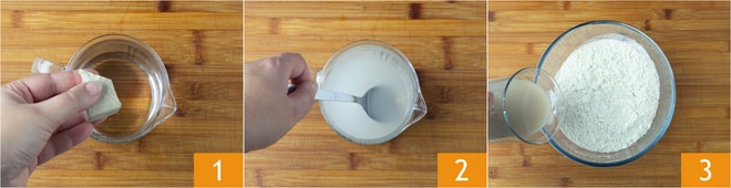 Para preparar los sgabei, lo primero que hay que hacer es poner la levadura en un vaso 1, añadir el agua tibia y disolverla 2. En un bol poner la harina y verter toda el agua 3.