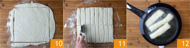Con un cortapastas redefinir los bordes 10, luego dividir el rectángulo en tiras de 15 cm de largo por 2-3 cm de ancho 11. Obtendrás aproximadamente 16 piezas. Cubrir con un paño limpio y dejar levar durante 1 hora en un lugar seco y sin corrientes de aire. Calentar el aceite de semilla de cacahuete a una temperatura de 170-175°C y freír 2-3 sgabei a la vez 12, para no bajar demasiado la temperatura del aceite.