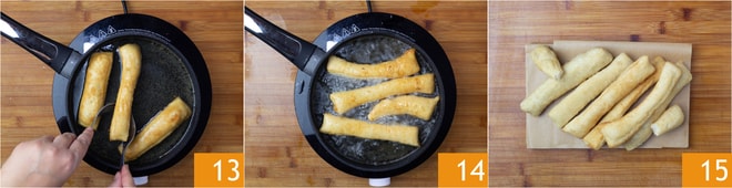Cocinar durante 2 minutos por cada lado 13. Una vez estén bien dorados 14, colocarlos sobre papel absorbente para eliminar el exceso de aceite. Sazonarlos con un poco de sal y tus sgabei estarán listos para ser servidos 15.