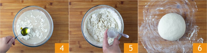 Añadir el aceite 4 y comenzar a amasar con una cuchara. Añadir la sal 5, luego trasladarse a una superficie de trabajo y amasar hasta obtener una masa lisa y homogénea 6.