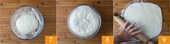 Transferirla a un bol enharinado 7 y dejarla levar, cubierta con film, en un lugar seco y sin corrientes de aire durante 3 horas o hasta que doble su tamaño 8. Retomar la masa y extenderla con un rodillo hasta crear una lámina de 1 cm de grosor 9.