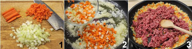 Para preparar el shepherd's pie, comienza picando la cebolla y reduciendo a pequeños cubos el apio y las zanahorias 1. Derrite en una cacerola la mantequilla y el aceite y añade la cebolla, las zanahorias y el apio, que dejarás dorar por unos minutos 2. Luego añade la carne de cordero picada y deja que se dore bien, separándola y "desmigajándola" con la cuchara de madera 3.
