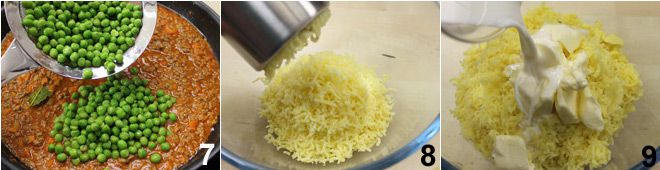 Añade los guisantes congelados 7, ajusta de sal y pimienta y cocina hasta que los guisantes estén tiernos. Mientras la salsa cocina, prepara el puré para cubrir: cocina las patatas con la piel en agua salada hasta que estén tiernas (aproximadamente 30 minutos). Pélalas y pásalas por el pasapurés aún tibias 8. Añade la leche tibia, la mantequilla a temperatura ambiente 9,