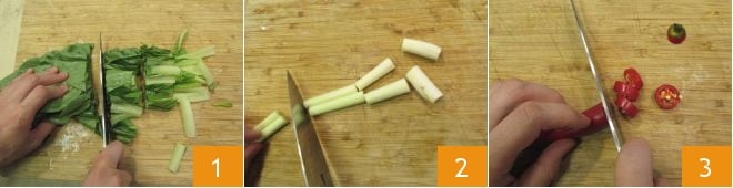 Para preparar la sopa con albóndigas de cerdo y jengibre, primero pon a hervir el agua en una olla grande, luego pasa a la preparación de los ingredientes para el caldo. Lava las acelgas, elimina la parte final de los tallos y córtalas en trozos grandes 1. Lava los tallos de lemongrass, retírales los extremos y córtalos también en trozos bastante grandes 2. Finalmente, lava la guindilla y córtala en rodajas 3.