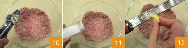 Mientras tanto puedes ocuparte de la preparación de las albóndigas: coloca la carne picada de cerdo en un bol grande, añade el diente de ajo machacado 10, sal 11, pimienta, el jengibre rallado 12