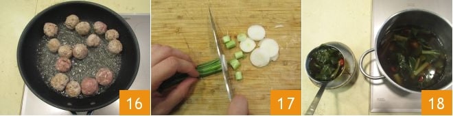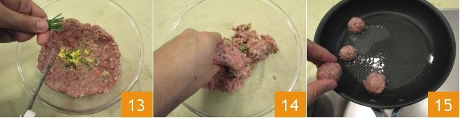 y el cebollino cortado finamente 13, luego mezcla la mezcla con las manos 14 y forma bolas de unos 3 cm de diámetro. Calienta el aceite de semillas en una sartén, coloca las albóndigas dentro 15