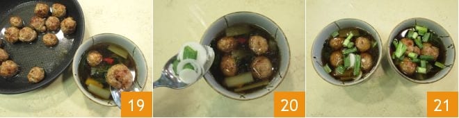 luego añade unas 4 albóndigas por persona 19 y decora con cebollino fresco 20. ¡Tu sopa con albóndigas de cerdo y jengibre está lista para ser disfrutada bien caliente 21!