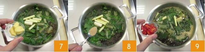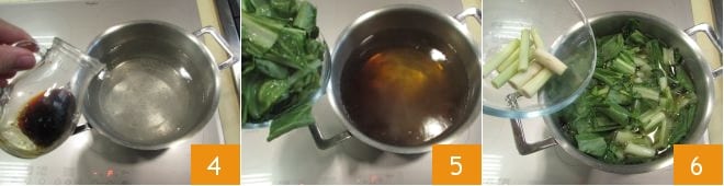 Cuando el agua haya llegado a ebullición, añade la salsa de soja 4, las acelgas 5, el lemongrass 6,