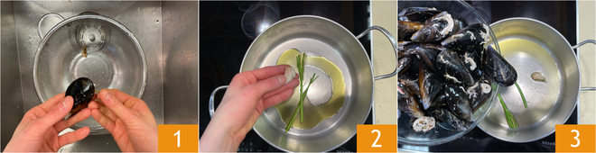 Para preparar la sopa de alubias blancas y mejillones, empezad por la Cómo limpiar y abrir los mejillones: retirad la barba y enjuagadlos bajo el agua corriente, frotando la concha con un estropajo de acero 1. En una cazuela calentad la mitad del aceite con los tallos de perejil y el ajo pelado 2. Cuando el fondo esté caliente, añadid los mejillones 3.