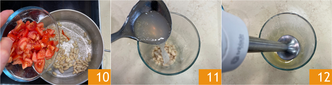 Añadid los tomates cortados a la sartén 10 y cocinad 2-3 minutos a fuego suave. Mientras tanto verted unos 500 g del agua de los mejillones en el vaso 11 y triturad 12 hasta obtener una crema.