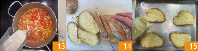 Incorporad la crema de alubias a la sartén y continuad la cocción durante unos 20 minutos, para que el líquido se reduzca un poco 13. Mientras tanto, cortad el pan en láminas 14 y aliñad con aceite y sal 15.
