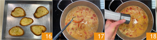 Tostad las rebanadas de pan en el horno a 200° durante 6-7 minutos 16. Transcurrido el tiempo de cocción de la sopa, retirad el ajo y la guindilla 17, y corregid de sal 18.