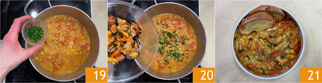 Apagad el fuego y decorad con el perejil picado 19. Por último añadid los mejillones sin concha 20 y mezclad bien. ¡Servid vuestra sopa de alubias y mejillones acompañada con los picatostes de pan 21!