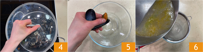 Cubridlos enseguida y esperad unos minutos hasta que se abran 4. Cuando estén todos abiertos, retiradlos de la concha 5 y colad el líquido de cocción 6. Reservad. Cortad los tomates en cuartos.