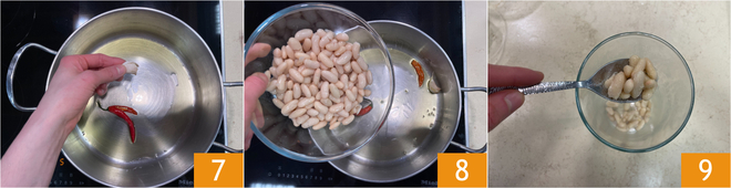 En una olla calentad la otra mitad del aceite con la guindilla partida por la mitad y el ajo 7, añadid las alubias, salad y dejad que tomen sabor a fuego bajo durante unos 6-7 minutos 8. Retirad la mitad de las alubias y pasadlas al vaso de la batidora 9.