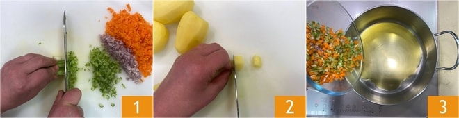 Para preparar la sopa de arroz con legumbres, lava y corta en brunoise las verduras para el sofrito, es decir, apio, zanahoria y cebolla 1. Pela las patatas y córtalas en cubos de aproximadamente 2 cm 2. En una cacerola, vierte el aceite y el picadillo para el sofrito 3.