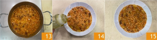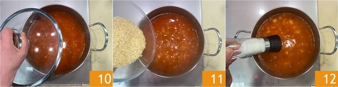 Cubre con una tapa 10 y cocina a fuego medio durante 20 minutos. Transcurrido el tiempo de cocción, añade el arroz 11 y mezcla, luego ajusta de sal 12. Cubre con la tapa y deja en el fuego durante otros 10 minutos, removiendo de vez en cuando.