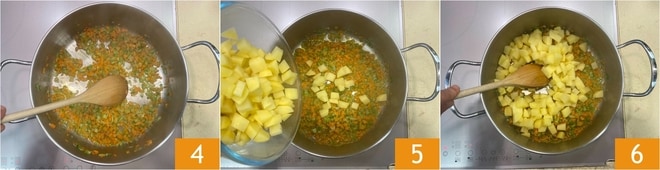Sofríe a fuego lento durante unos 10 minutos 4, luego añade las patatas 5 y mezcla 6.