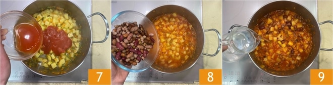 Agrega también la salsa de tomate 7 y las legumbres 8. Cocina durante un par de minutos, luego vierte el agua 9.