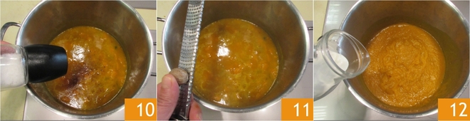 Cuando la calabaza esté muy tierna y casi deshecha, ajusta la sal 10 y la pimienta, luego aromatiza con la nuez moscada 11. En este punto, añade casi toda la nata 12, reservando un poco para la decoración final.
